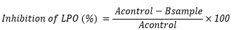 Where, A0 is the absorbance of the control without a sample, A1 is the absorbance after adding the sample 2-Deoxy-D-ribose, A2 is the absorbance of the sample without 2-Deoxy-D-ribose. Then the percentage of inhibition was plotted against concentration.