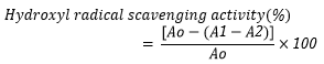 Hydroxyl radical scavenging activity of the extracts was determined by the method [31]. The reaction mixtures contained 0.8 ml of phosphate buffer solution (50 mmol/l, pH 7.4), 0.2 ml of PPFRH/standard at different concentrations, 0.2 ml of ethylene diamine tetra acetic acid (1.04 mmol/l), 0.2 ml of FeCl3 (1 mmol/l) and 0.2 ml of 2-Deoxy-D-ribose (28 mmol/l) were taken in the test tubes. The mixtures were kept in a water bath at 37 °C and the reaction was started by adding 0.2 ml of ascorbic acid (2 mmol/l) and 0.2 ml of H2O2 (10 mmol/l). After incubation at 37 °C for 1 h, 1.5 ml of cold thiobarbituric acid (10 g/l) was added to the reaction mixture followed by 1.5 ml of HCl (25%). The mixture was heated at 100 °C for 15 min and then cooled down with water. The absorbance of the solution was measured at 532 nm with a spectrophotometer. The hydroxyl radical scavenging activity was evaluated with the inhibition of percentage of 2-Deoxy-D-ribose oxidation on hydroxyl radicals. The percentage of hydroxyl radical scavenging activity was calculated according to the following formula: