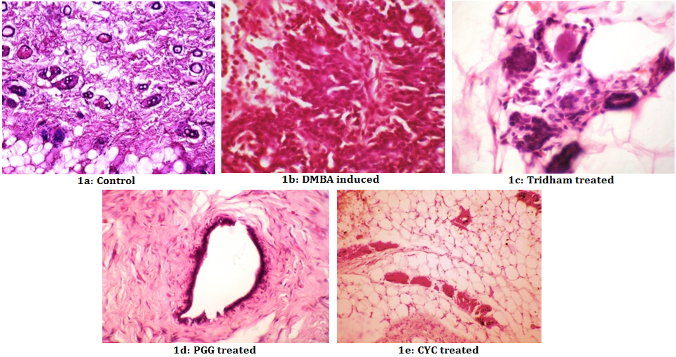 Fig. 1 shows the histology of breast tissue in control and experimental animals. Normal rats showed mammary gland skin with underlying fibro fatty tissue containing scattered mammary gland ducts and bundles of skeletal muscles (fig. 1a) whereas DMBA-induced rats showed parts of a tumour composed of hyperchromatic, pleomorphic cells with vesicular nuclei and moderate cytoplasm arranged in nests, sheets and acinar structures with numerous mitotic fig. (fig. 1b). Mammary carcinoma bearing rats treated with TD, PGG and control drug, cyclophosphamide showed foci of necrotic cells and fibro fatty tissue with few ducts (fig. 1c,1d and 1e,).