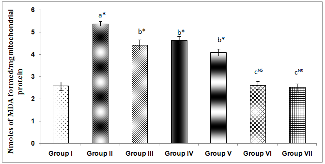 Fig. 2: Effect of TD and PGG on lipid peroxides in mammary gland of control and experimental animals. Values are expressed as mean±SD for six animals. Comparison is made as a-Group I vs Group II; b-Group II vs Groups III, IV and V; c-Group I vs Groups VI and VII. Statistical significance: *P<0.05. NS: Non significant