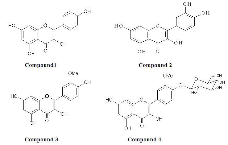 Ethyl acetate extract of A. cepa (ssp. red onion) (5.50 g) was subjected to column chromatography (3×60 cm) packed with silica gel 60 (70-230 mesh, Merck) as stationary phase. Elution started with petroleum ether, petroleum ether/ CHCl3 mixture, CHCl3 and then CHCl3/ MeOH gradient and ending with pure methanol. Fractions 250 ml each were collected, concentrated and examined by TLC silica gel using solvent systems; Benzene: MeOH (9:1 and 8:2), CHCl3: MeOH (9:1 and 8:2) and CHCl3: MeOH: H2O (7: 3: 0.5) and on PC using solvent system 15% AcOH and 4: 1: 5 BuOH: AcOH: H2O (BAW). Chromatograms were visualized under UV before and after spraying with AlCl3 (2%), FeCl3 (1%) and 20% H2SO4. Four major fractions (I-IV) were obtained. Fraction (I) eluted with pure CHCl3 was concentrated and purified on sephadex LH-20 column (2×50 cm) using H2O/ MeOH as eluent and the resulted fractions were examined by paper chromatography Whatmman No (1) using solvent system 15% AcOH to give compound 1. Fraction II eluted with CHCl3 - MeOH (98: 2) and re-chromatographed over sephadex LH-20 column using H2O/ MeOH as eluent and then purified on preparative paper chromatography Whatmman No (3) using solvent system 15% AcOH to give compound 2. Fraction III eluted by 95% CHCl3 was subjected to sub- column sephadex LH-20 and H2O/ MeOH as eluent to give compound No 3 and 4.