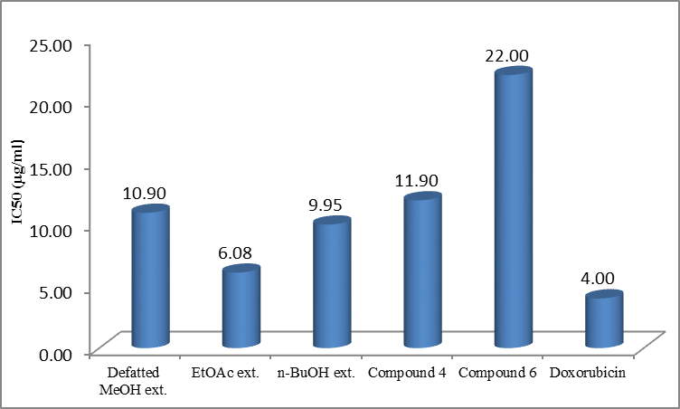 Many investigations indicate that phenolic compounds are of great value in preventing the onset and progression of cancer. They are toxic to cancer cells, but are not toxic or are less toxic to normal cells. So it plays an important role in the prevention of cancer [22, 23]. In present study, ethyl acetate fraction which derived from the defatted methanolic extracts of A. cepa (ssp. red onion) is the most active extract (IC50 = 6.08 µg/ ml) against human liver carcinoma cell lines HepG2 as shown in figure (1) and its activity is nearby doxorubicin (IC50 = 4.0 µg/ ml) which used as cytotoxic standard. The butanolic fraction and defatted methanolic extract have IC50 = 9.95 and 10.9 µg/ ml respectively lower than ethyl acetate fraction. Compound 4 (isorhamnetin-4`-O-β-D-gloucopyranoside) which isolated from EtOAc fraction has IC50 = 11.9 µg/ ml and compound 6 (β-D-glucopyranosyl- α- D-glucopyranoside) which isolated from n-BuOH fraction has IC50 = 22.0 µg/ ml. According to the National Cancer Institute guideline, an extract and/or a compound with IC50 values < 20 𝜇g/mL is considered active on hepatocellular carcinoma cell line [24, 25]. These results indicated and confirmed that phenolic compounds especially flavonoids have high cytotoxic activity and it depend on the number of hydroxylation and glycosylation of phenolic compounds as reported by Kathrin et al., 2007 [26] who stated that there is inverse correlation between the cytotoxicity and the number of hydroxyl phenolic groups of flavonoids.