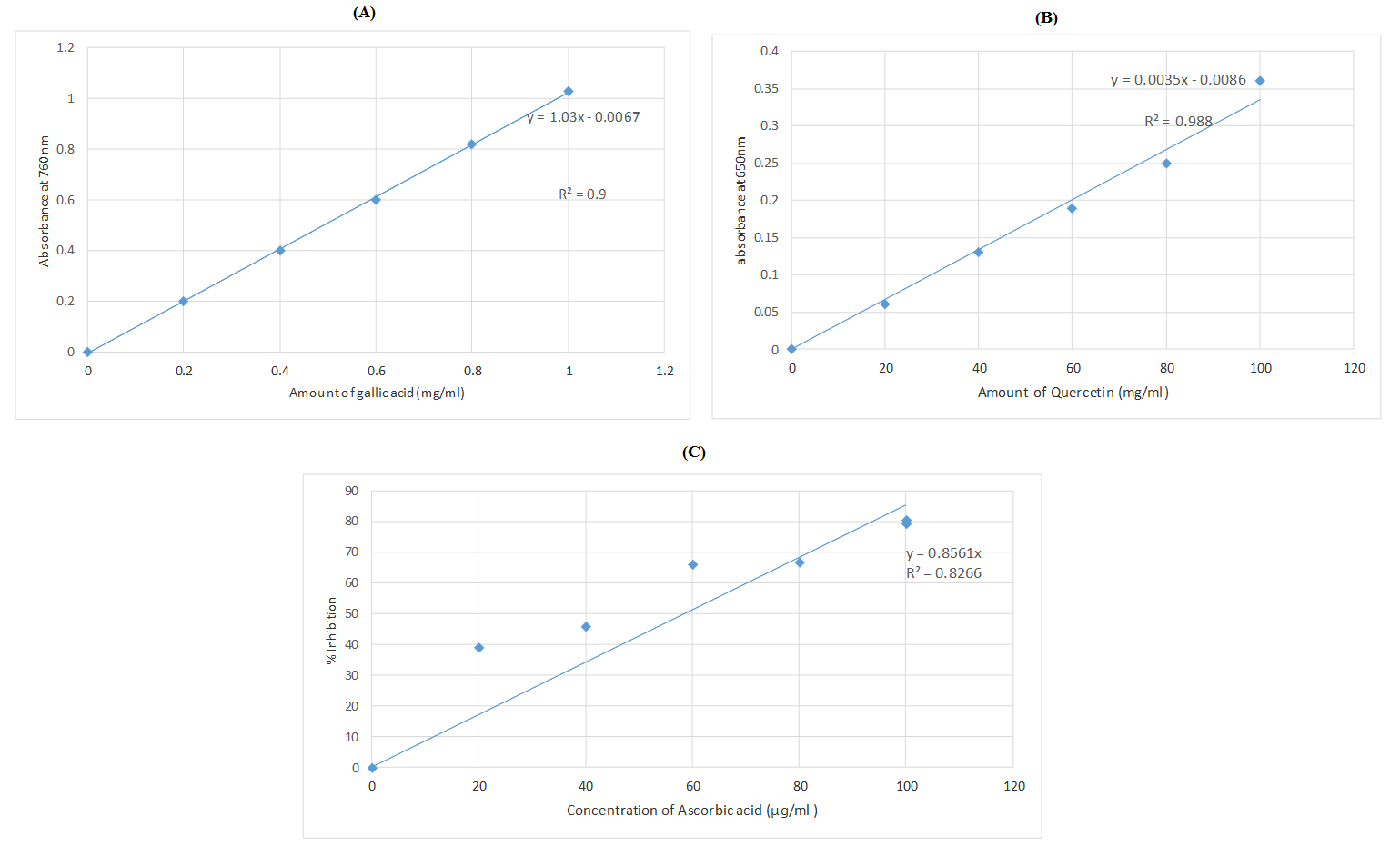 Fig. 1: Calibration curve for gallic acid (A), quercetin (B) and DPPH radical scavenging activity (C)