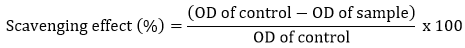 Scavenging of hydrogen peroxide was assayed according to the method of Ruch [28]. Plant extract at 30 µg/ml concentration in 3.4 ml phosphate buffer was added to 0.6 ml of 45 mmol H2O2 solution absorbance of the reaction mixture was recorded at 230 nm. A blank solution contained the sodium phosphate buffer without H2O2. Ascorbic acid was used as a standard. The concentration of H2O2 (mM) in the assay medium was determined using a standard curve (y = 0.123x+2.2; R2 = 0.9583). H2O2 scavenging ability was calculated as IC50. The scavenging effect was calculated as follows: