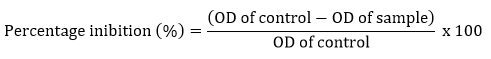 The antibacterial activity was carried out by employing 48 h cultures of Staphylococcus aureus, Escherichia coli, Pseudomonas aeruginosa and Klebsiella pneumoniae. The activity of aqueous and methanolic extracts of different concentrations 60, 70, 80 % of L. aspera was tested separately using Agar well diffusion method. The medium was sterilized by autoclaving at 120 °C (15 lb/in2). About 30 ml of the Agar medium was poured in respective sterile Petri plates and were left at room temperature for solidification. 1 ml of the respective test cultures were swabbed on the top of the solidified media and allowed to dry for 10 min. A well of 6 mm diameter was made using a sterile cork borer. The standard drug and extracts were placed in the well. Antibacterial assay plates were for overnight incubation. Ciprofloxacin (50 µg/disc) was used as a positive control for antibacterial activity. After 24 h of incubation at 37 °C, Zone of Inhibition (ZOI) was observed and diameter measured.