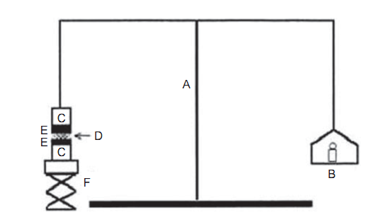 Fig. 1: Modified chemical balance for measuring mucoadhesive force (A) modified balance; (B) plastic jar; (C) glass vial; (D) gel formulation; (E) tissue; (F) height-adjustable pan [17]
