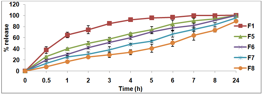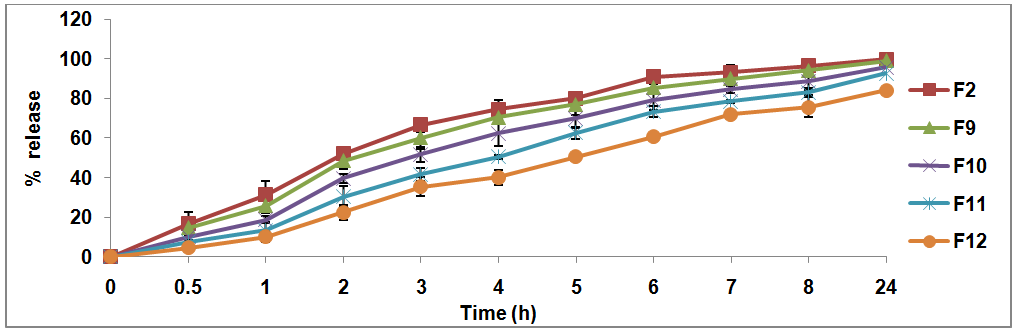 The release of drug in a semisolid dosage form depends on the viscosity of the formulation. It is also possible that the drug was trapped by higher polymer concentrations so that resistance increases to diffuse drug molecules. Additionally, drug movement area limited by the density of chain structures increased at higher polymer concentrations [5].