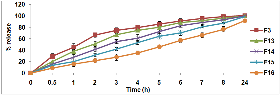 Fig. 3 depicted that the release of the drug from MBGs was slightly slower than its release from conventional formulation irrespective lower viscosity of MBGs. This might be due to the partitioning of the drug into the oil phase of ME gel, which retarded the drug release [38]. In the present study, MBGs were also compared with MEs in fig. 3. It was observed that the release of sulpiride from MBGs was lower than MEs, which may be due to the higher viscosity of the MBGs which may act as a barrier for drug release [19]. Due to low viscosity, MEs possessed good mobility, contributed to its freedom movements through the membrane. Also, an initial burst of the drug observed in MEs decreased after addition of carbopol that may be attributed to the difference in the viscosity of the polymers.