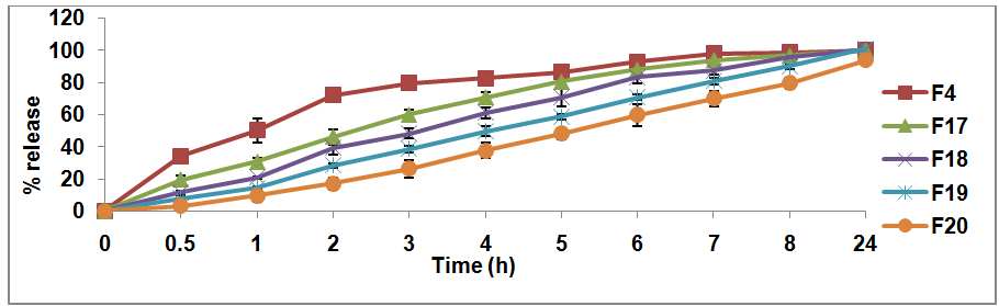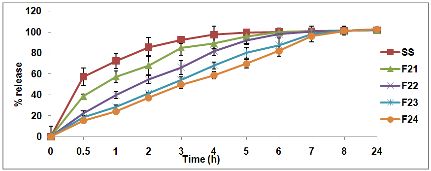 Fig. 4: In vitro release of sulpiride from conventional gel containing different concentration of carbopol 940* Each point is the mean±SD (n=3)
