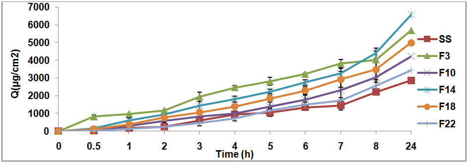 Fig. 5: Ex-Vivo permeation of sulpiride from different MBGs compared to SS and ME (F3) Q: cumulative amount of drug permeated per unit surface area (µg/cm2) *Each point is the mean±SD (n=3)