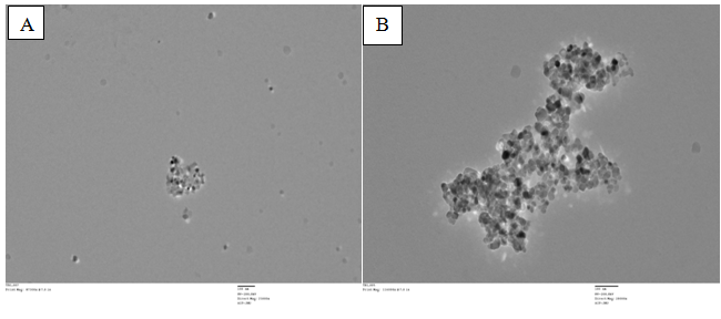 Fig. 2: Transmission electron micrograph of TiO2 nanoparticles (A) and TiSiO4 nanoparticles (B). Scale bar = 100 nm