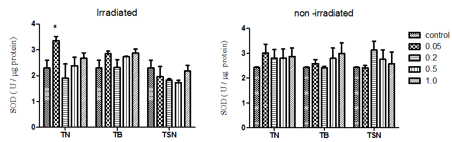 Fig. 3: Effect of irradiated/non-irradiated TiO2 nanoparticle (TN), TiO2 bulk powder (TB) and TiSiO4 nanoparticle (TSN) on SOD activity (U/µg protein) in roots of Vigna radiata. Within each group (TN, TB, and TSN) the data points were compared with the control for the significance in difference. A common control was used for all the irradiated groups, and another common control was used for all the non-irradiated groups. n=3, data points are mean±standard error means, significant at *p<0.05. All the means which were not significantly different as compared to the control were not assigned to any symbol