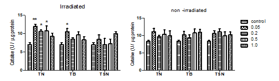 As shown in fig. 4, in the seedling roots of irradiated TN treated group, an increase in the catalase activity at concentration 0.05 g/l was found highly significant (71%, p<0.01). While at the concentration of 0.2 g/l and 0.5 g/l the catalase activity increase was found significant with an increase of 52%, (p<0.05) and 53% (p<0.05%) respectively when compared to the control group. However, in irradiated TB group, there was a 51% (p<0.05%) increase in catalase activity at the concentration of 0.05 g/l as compared to the control, but there were no significant changes in the catalase activity found in non-irradiated TN and TB groups. In TSN groups no significant changes were observed among the groups at any concentration as compared to the control.