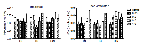 Fig. 5: Effect of irradiated/non-irradiated TiO2 nanoparticle (TN), TiO2 bulk powder (TB) and TiSiO4 nanoparticle (TSN) on MDA content in roots of Vigna radiata. Within each group (TN, TB, and TSN) the data points were compared with the control for the significance in difference. A common control was used for all the irradiated groups, and another common control was used for all the non-irradiated groups. n=3, data points are mean±standard error means, FW= Fresh weight. All the means which were not significantly different as compared to the control were not assigned to any symbol