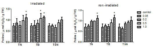 Fig. 6: Effect of irradiated/non-irradiated TiO2 nanoparticle (TN), TiO2 bulk powder (TB) and TiSiO4 nanoparticle (TSN) on proline content in roots of Vigna radiata. Within each group (TN, TB, and TSN) the data points were compared with the control for the significance in difference. A common control was used for all the irradiated groups, and another common control was used for all the non-irradiated groups. n=3, data points are mean±standard error means, significant at *p<0.05. All the means which were not significantly different as compared to the control were not assigned to any symbol