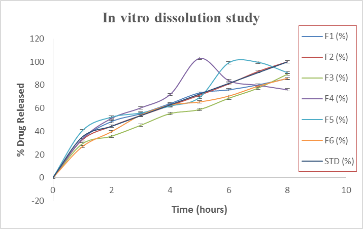 From this study, it was found that formulation F2 (formulation with HPMC K15M and kappa-carrageenan) was giving almost same release pattern as that of a theoretical release pattern of the drug. Formulation F4 and F5 with xanthan gum and poloxamer 68, respectively, could not sustain the release of the drug for more than 6 h. After 2 h, 50% of the drug was released from these formulations. Hence, these polymers are not the good release-retarding polymers for preparing matrix formulations. Formulations F1, F3 and F6 with sodium alginate, pullulan and only HPMC, respectively, showed the delayed release of the drug from the matrix. Only 85% of the drug was released from these formulations in 8 h. All the formulations can be optimized by varying the concentration of the release retarding polymer.