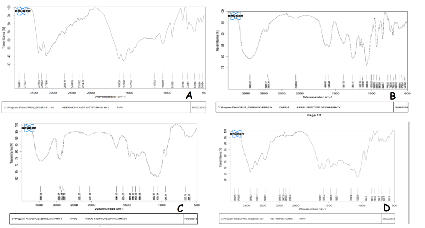 Fig. 2: FTIR scan obtained for metformin hydrochloride (A), kappa carrageenan (B), HPMC K15M (C) and optimized formulation (D)