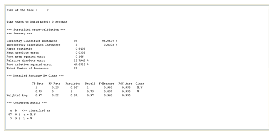 On stratified cross-validation after 0.02 sec build model of classifiers - Naive Bayes Classifier, SMO, KStar Beta Verion (0.1b), AdaBoost, bagging, rules. PART; and Trees. J48 represents % of accuracy of 95.9596 %, 95.9596 %, 93.9394 %, 95.9596 %, 95.9596 %, 96.9697 %, 96.9697 % respectively. Also, the incorrect classified instants/ inexactness evolved 4.0404 %, 4.0404 %, 6.0606 %, 4.0404 %, 4.0404 %, 3.0303 %, 3.0303 % respectively. Thus, the accuracy is excellent covering within the limits of (±15%) as a correct classified instant. And depending on the correct classified instant 95, 93, 96 the class attributes denoting by a = NW & b =W Matrix values are 84│11, 84│9, 87│9 respectively. On briefly undergoing through the Kappa Statistics, Mean absolute errors, Root mean squared error, Relative absolute error, root relative square error; and also understanding the correct & incorrect classified instant, it was discovered that classifiers statistical results and values are nearly same.