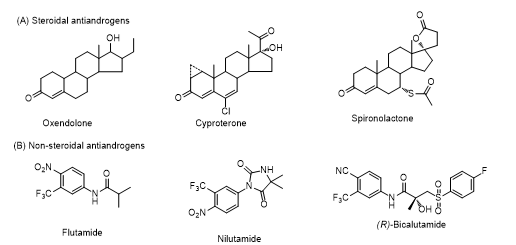 But this therapy failed due to several drawbacks attributed to the non-specific effects of steroidal antiandrogens such as cross-reactivity, poor bioavailability and lack of tissue selectivity, etc. these limitations has shifted the focus of researchers towards non-steroidal class of anti-androgens as a potential of diminishing the cross reactions with other steroidal hormones which eliminates the unwanted side effects [12]. Another important application of non-steroidal antiandrogens is their potential to provide various structural modifications to afford more potent scaffolds. Although this approach initially shows an 80–90% response rate, but when treatment is continued for 1–2 y, approximately 50% of patients progress to fatal androgen independent disease [13-41].