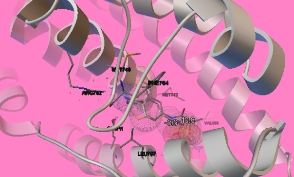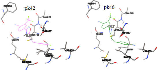 The close contacts have shown for the most potent compounds pk42 and pk46 from both classes of designed ligands. The ribbon structure of a protein is depicting the docked conformation of ligand onto the active site of protein as shown in fig. 5 and fig. 6.