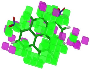 Fig. 2a: Pictorial representation of the contours generated for various properties, a) hydrophobic property; the green cubes indicate favorable regions while violet cube indicates unfavorable hydrophobic regions for the activity.