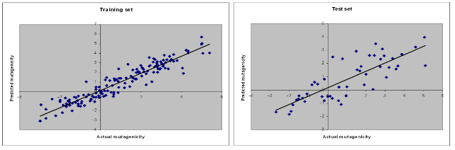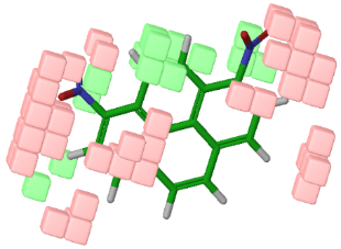 The model showed that, compounds with higher logP values are likely to be mutagenic [1]. Nonetheless, the logP does not give idea of three-dimensional arrangement, shape and size of hydrophobic groups, which appear to be critical in determining the mutagenicity of a molecule. For instance, the activity of a non-mutagenic compound, 1,2,3-trichloro-4-nitrobenzene, (actual log mutagenicity: -2.94) was highly overestimated (predicted log mutagenicity: 0.18) by the Hansch model [1], due to the high logP value 3.61, owing to presence of three chloro atom substitutions. On the other hand, the model generated here predicted reasonably low mutagenicity for this compound. Furthermore, the visualization of green cubes clearly predicts this compound as non-mutagenic. Thus, the three-dimensional representation of hydrophobic property has clear advantage over the simple logP for mutagenicity prediction.