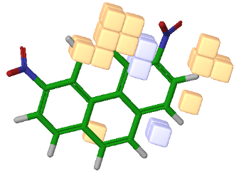 In Figure 2b, red color cubes represents electron withdrawing group favored regions for mutagenicity, while light green color cubes represents electron withdrawing group disfavored the regions for mutagenicity. The presence of more red cubes points the fact that nitroaromatic compounds with electron withdrawing group substitutions are likely to be more mutagenic. All most mutagenic compounds have two or more nitro group substitutions. Vance et al. [47] also noted the negative effect of electron donating substituents on the mutagenicity pointing out that p-dinitrobenzene is mutagenic while p-nitrophenol is not. In Figure 2c, orange cubes represent the hydrogen bond donor group regions disfavored for mutagenicity, while light blue cubes represents the hydrogen bond group donor favored regions for mutagenicity. Thus, substitution of hydrogen bond donor group in the vicinity of nitro group should decrease the mutagenicity. In this regard, 2-nitro-m-phenylenediamine with two hydrogen bond donor amino groups in the vicinity of nitrogroup was found to be non-mutagenic.