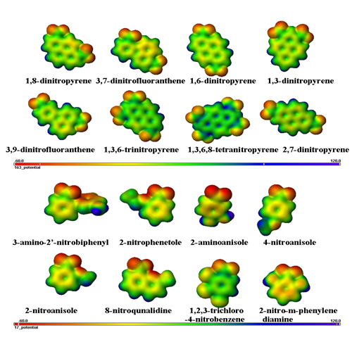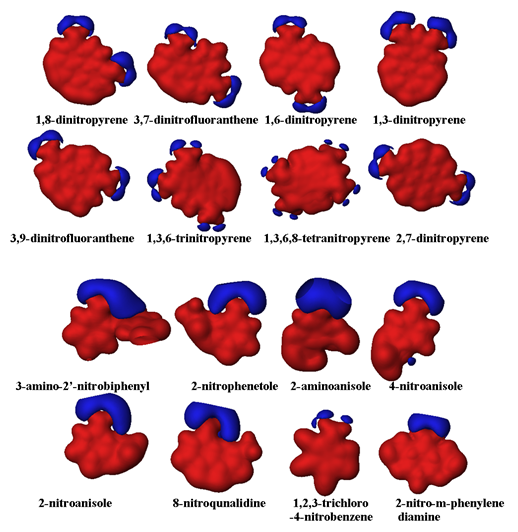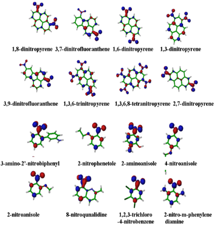The results show that most of the mutagenic nitroaromatic compounds share specific electronic properties and are different from non-mutagenic compounds. For comparative purpose, the MESP of eight most mutagenic compounds viz. 1,8-dinitropyrene, 3,7-dinitrofluoranthene, 1,6-dinitropyrene, 1,3-dinitropyrene, 3,9-dinitrofluoranthene, 1,3,6-trinitropyrene, 1,3,6,8-tetranitropyrene and 2,7-dinitropyrene; and eight non-mutagenic compounds viz. 2-nitro-m-phenylenediamine, 1,2,3-trichloro-4-nitrobenzene, 8-nitroquinalidine, 2-nitroanisole, 4-nitroanisole, 2-aminoanisole, 2-nitrophenetole and 3-amino-2’-nitrobiphenyl; are discussed here, but the trend of MESP remains similar for rest of compounds based on their mutagenicity value. MESP plotted onto constant electron density surface of 0.01 e/au3 for all compounds showed the presence of localized most electronegative potential region (red color) near the oxygen atoms of the nitro group, the most mutagenic compounds have two or more localized most electronegative potential regions owing to presence of two to more nitro groups, while non-mutagenic compounds have only one localized most electronegative potential region in the vicinity of nitro group (Figure 3).