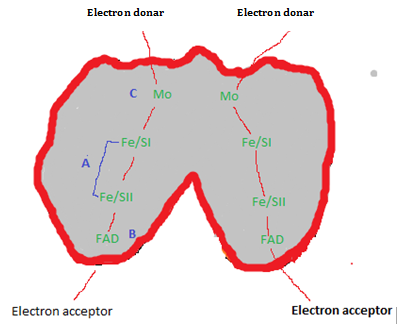 XOR is a molybdenum-containing enzyme belongs to XO family. All the enzymes of this family possess multiple iron-sulfur clusters (at least two) in addition to the molybdenum center and FAD. Mammalian XOR is a homodimer consisting of two independent subunits with a molecular mass of 145KDa [6, 9-11]. Each subunit consists of one molybdopterin (MO-pterin) unit, two un-identical non-sulphur redox centers (Fe/SI and Fe/SII) and FAD as cofactor distributed in the C-terminal (85 KDa), N-terminal (20 KDa) and intermediate (40 KDa) domains respectively [9, 12-13]. Members of the XO family of enzymes usually catalyzes the oxidative hydroxylation of carbon center of their substrates typically aromatic heterocyclic’s or aldehydes. In this mechanism Mo (VI) is reduced to Mo (IV) at the active site [2]. This follows the oxidation of fully reduced XOR molecule includes the transfer of its six electrons to acceptor [14, 15]. Usually the substrate binds to the active site positioned nearer to molybdenum domain from there electrons transfers to acceptor through iron-sulfur proteins and flavin adenine dinucleotide (FAD) respectively [16]. Electron transfer is independent in two independent subunits [2].