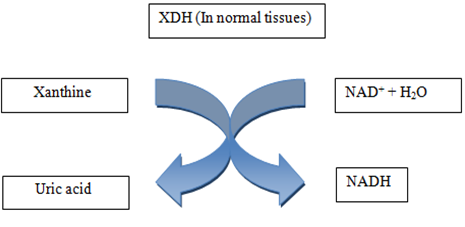 Fig. 4: Mechanism of action of XDH: Xanthine donates electrons to NAD+ and oxidizes to uric acid. NAD+ accepts the electrons and is reduced to NADH in normal tissues