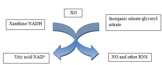 Recently NADH oxidase activity of an enzyme has been identified where NADH donates its electrons directly to FAD to an electron acceptor O2 [19]. And also some papers have reviewed nitrates reducing power of XOR especially XO form. XO can reduce inorganic nitrates, glyceryl nitrates to nitric oxide (NO) under hypoxic conditions in the presence of NADH or xanthine as a reducing substrate which acts as an important signaling molecule. Moreover, in the presence of O2, superoxide reacts rapidly with NO to generate reactive nitrogen species (RNS) particularly peroxynitrite an even more powerful bactericidal agent [17, 20-21]. A further complication is that this reaction can affect vasodilation effect of NO particularly in the ischemic conditions of vasculature when NO synthase activity is low. In this context, the two enzymes can be seen as complementary [22].