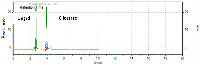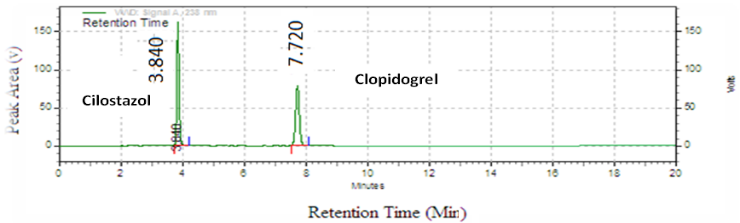 The chromatogram for the tablet sample showed two peaks with RT of 3.841 and 7.742 min for cilostazol and clopidogrel respectively indicating that there is no interference of the excipients present in the tablet formulation.