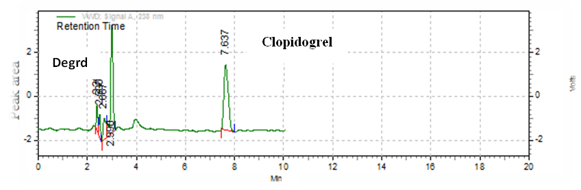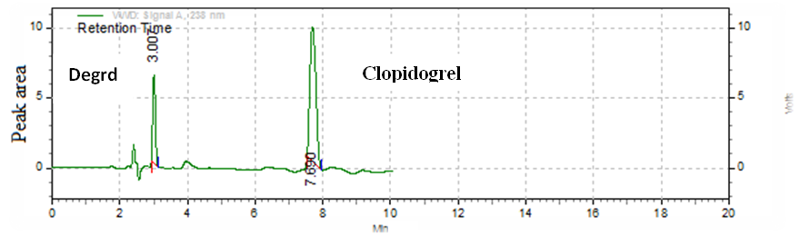 In the forced degradation study, cilostazol on treatment with 20 % H2O2 solution exhibited 27.88 % degradation with the appearance of the degradation product peak at RT 2.69 min which was well resolved from the standard peak at RT 3.92 min (fig. 4). In the acid and base induced hydrolysis study of clopidogrel, achieved on treatment with 5N HCl and 0.1N NaOH respectively, clopidogrel showed 28.57 % and 25.30 % degradation with the appearance of degradation product peaks at RT 3.017 min and 2.99 min respectively (fig. 5 and fig. 6). Both the degradation peaks were well resolved from the standard peak at RT 7.6 min. The tablet sample on exposure to these degradation conditions did not show any additional peaks indicating that it is stable and has not undergone degradation.