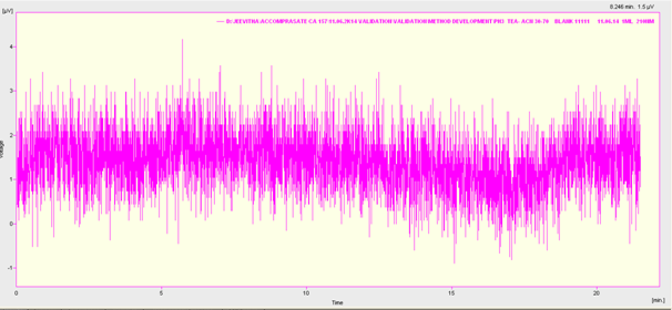Figures 3-5 for blank, standard drug solution and sample chromatogram reveal that the peaks obtained in the standard solution and the sample solution at working concentrations are only because of the drugs as blank has no peak at the retention time of acamprosate calcium. Accordingly it can be concluded that, the method developed is said to be specific.