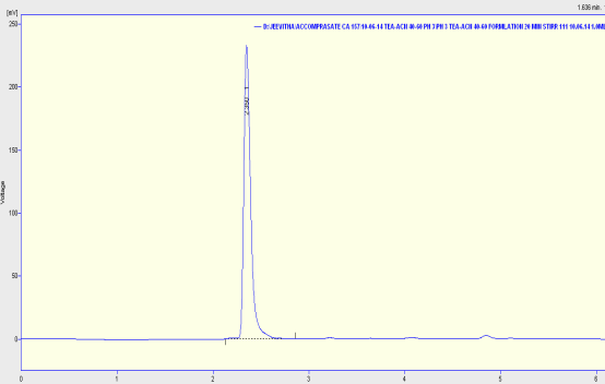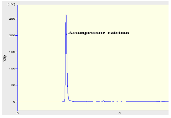 In order to test the applicability of the developed method to a commercial formulation, ‘ACAMPROL was chromatographed at working concentration (150µg/ml) and it is shown in Figure 5. The sample peak was identified by comparing the retention time with the standard drug Figure 4. System suitability parameters were within the acceptance limits, ideal for the chromatographed sample. Integration of separated peak area was done and drug concentration was determined by using the peak area concentration relationship obtained in the standardization step. The protocol affords reproducible assay of the drug in the sample ranging between 98 and 102%, which is the standard level in any pharmaceutical quality control.