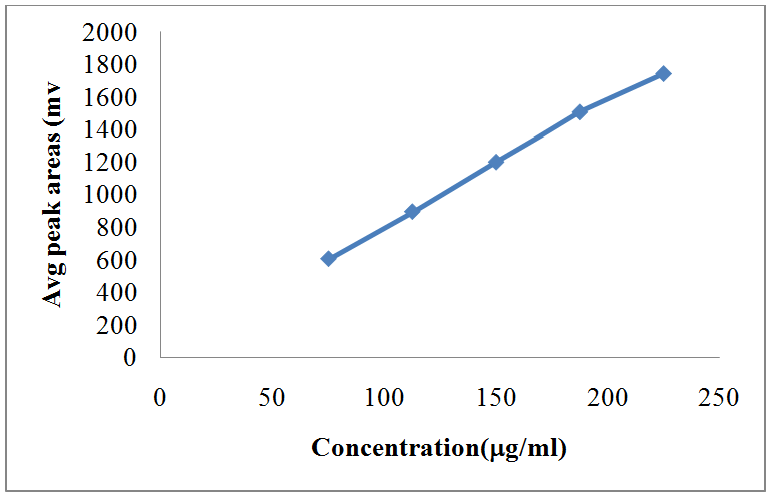 Standard solutions of acamprosate calcium at different concentrations level (50%, 75%, 100%, 125%, 150% and 175%) were prepared. Calibration curve was constructed by plotting the concentration level of drug versus the corresponding peak area. The results show an excellent correlation between peak area and concentration level of drug within the concentration range (16.65-58.27 µg/ml) for the drug and the results are given in table 4-5 and Figure 6. The correlation coefficient of acamprosate calcium is 0.998, which meet the method validation acceptance criteria and hence the method is said to be linear.