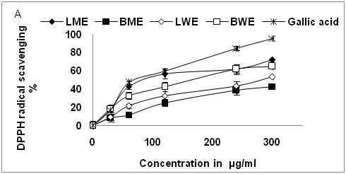 DPPH is a stable chromogen radical which was in purple color, upon reduction by donating hydrogen atom converted to pale yellow hydrazine which is generally evaluated in organic media by measuring the decrease in absorbance at 515-528 nm . Fig. 1A depict the results of DPPH radical scavenging activity of Phyllanthus indofischeri. These extracts show a concentration-dependent response of scavenging. The LME has highest scavenging ability followed by BWE, LWE and BME with an IC50 value of 148.18, 184.69, 272.48, 340.22 µg/ml, respectively, whereas, the gallic acid which was used as a standard shows an IC50 value of 107.77 µg/ml. These results are in agreement with other similar reports of strong DPPH radical scavenging activity of Phyllanthus species [42-44].