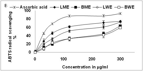 This method is applicable for both hydrophilic and lipophilic antioxidants. It is a decolourization technique in which radical is generated directly into a stable form prior to reaction with putative antioxidants. The ABTS* is a blue/green color chromophore was developed by the reaction between ABTS and persulphate, with absorption maxima at 745 nm. Percentage of inhibition of ABTS* is directly proportional to decolourisation and radical scavenging activity of the extract . Fig. 1B shows that the extracts of Phyllanthus indofischeri have good antioxidant potential against ABTS radical with respect to IC50 values. LME (111.98 µg/ml) and LWE (166.42 µg/ml) exhibited highest antioxidant activities compared to BME (241.23 µg/ml) and BWE (260.21 µg/ml). Ascorbic acid, which was used as a positive control had shown an IC50 value of 38.12 µg/ml, which is very effective when compared to the extracts. Our results are in concordance with similar reports of Phyllanthus niruri which has potential ABTS radical scavenging activity. Prieto et al. concluded that phenolic compounds were responsible for scavenging of ABTS*. Therefore, the antioxidant capacity of the extracts can be attributed to the polyphenols which play a vital role as antioxidant in living systems due to the para and ortho positions of hydroxyl groups.
