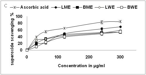 Fig. 1C indicates that the extracts of Phyllanthus indofischeri had good inhibitory potential against Riboflavin-NBT-light system in vitro. The scavenging potential of extracts were in the following order LME>BME>LWE>BWE with an IC50 value of 178.29, 212.90, 215.61, 251.07 µg/ml respectively in dose-dependent manner. The positive control ascorbic acid had an IC50 value of 53.52 µg/ml, which is more effective than that of extracts. Such crude extract superoxide radical scavenging properties are shown by some other plants . This assay was originally reported by Beauchamp and Fridovich, the sensitivity and specificity of this assay are quite remarkable. In the presence of oxidizable substances, the riboflavin undergoes reduction, which on reoxidation in air reduces flavins to generate O2ˉ, and reduces the colorless NBT to blue formazon .
