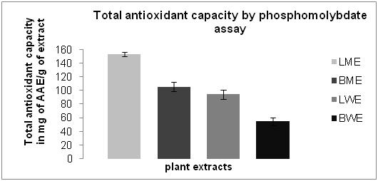 The total antioxidant capacity was stated in terms of AAE/g of dry extract; fig 2 shows the total antioxidant capacity of Phyllanthus indofischeri extracts by phosphomolybdate method. The antioxidant capacity ranges from 55.16 to 153.44 AAE/g dry weight of the extract. LME had shown the highest, whereas BWE was least among the extracts. Phosphomolybdate assay is very simple and quantitative in nature, hydrogen and electron transfer occurs from oxidant to molybdenum (VI) to convert it into molybdenum (V) green phosphate, which is measured spectrophotometrically. In general, this method uses to detect antioxidants such as vitamin C, E and some specific phenols .