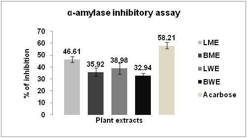 Fig. 3: α-amylase inhibitory activity of Phyllanthus indofischeri. Each value represents a mean±SD (n=3); LME= leaf methanolic extract of P. indofischeri, BME= bark methanolic extract of P. indofischeri, LWE= leaf water extract of P. indofischeri, BWE= bark water extract of P. indofischeri