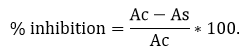 % inhibition is the percentage of α-amylase inhibitory activity, Ac is the absorbance of control, As is the absorbance of the sample.
