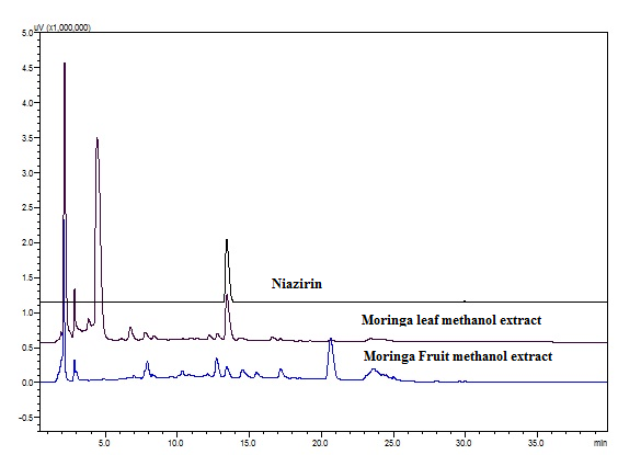 The niazirin content was found to be 1.14% w/w, 1.1 and 1.0% w/w in final blend extract, leaf methanol extract and fruit methanol extract respectively. The HPLC chromatograms of M. oleifera extracts and standard is shown in fig. 1