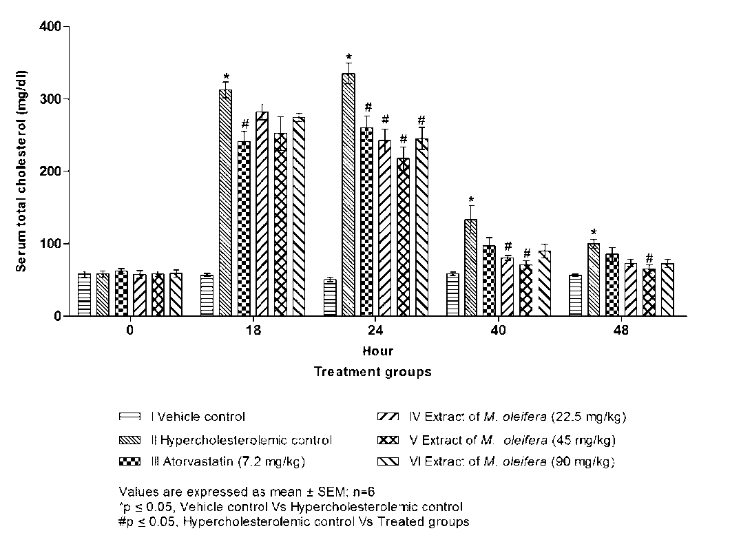The mean serum total cholesterol level of each group is presented in fig. 2. There was no significant change observed in the serum total cholesterol level at 0 h between all the groups. The hypercholesterolemic control group showed a significant increase in serum total cholesterol level at 18 h through 48 h when compared with the vehicle control group. The groups treated with M. oleifera (22.5, 45 and 90 mg/kg) showed a significant decrease in serum total cholesterol level from 24 h through 48 h when compared with hypercholesterolemic control group, except for a non-significant decrease at 40 h in 90 mg/kg treated group and at hr 48 in 22.5 and 90 mg/kg treated groups when compared with hypercholesterolemic control group.