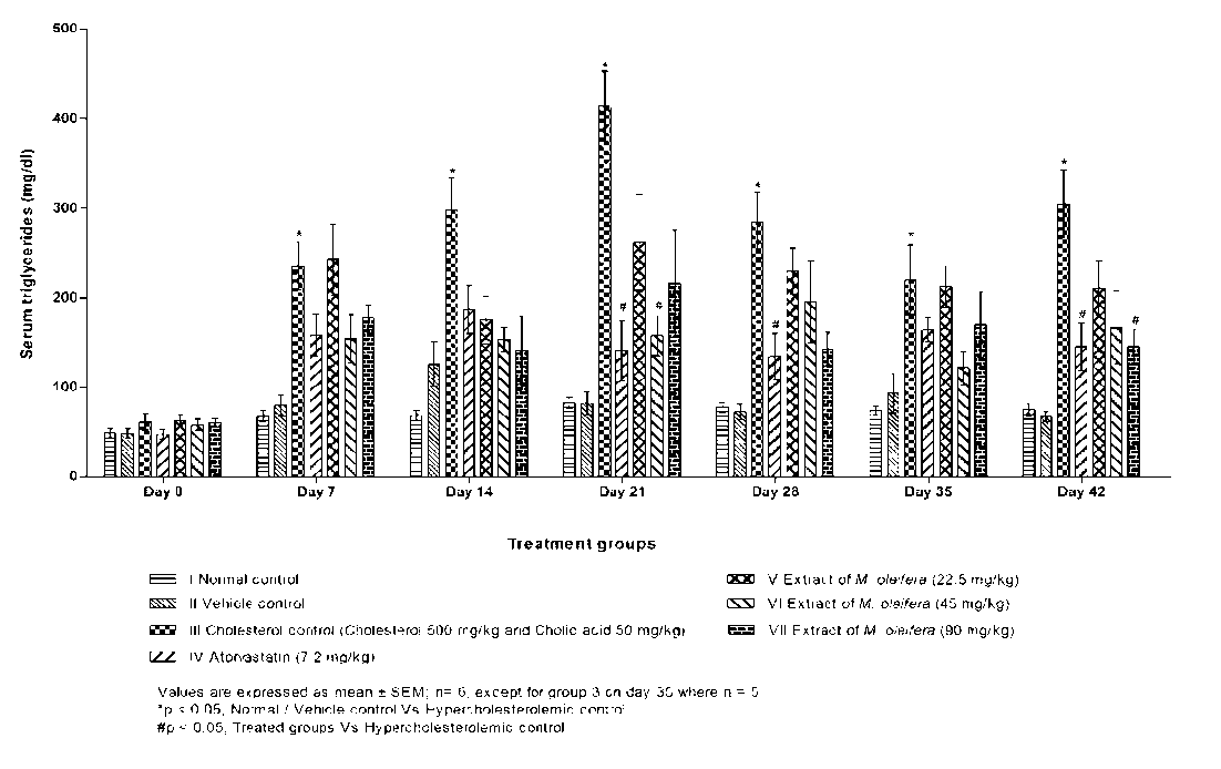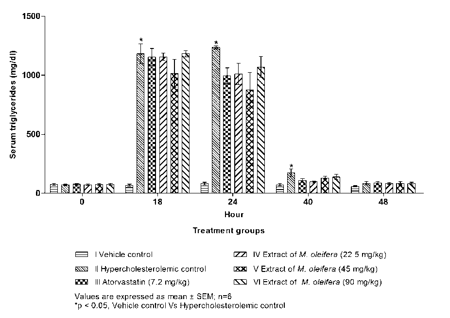 Group III was treated with atorvastatin (7.2 mg/kg). Groups IV-VI were treated with M. oleifera methanol extract mixture at the doses of 22.5, 45 and 90 mg/kg body weight respectively and Triton WR-1339; 200 mg/kg; i. p. The vehicle, reference standard and methanol extract blend were administered orally as a single dose. The blood samples of each animal were collected at different time intervals (18, 24, 40 and 48 h) post administration of Triton WR-1339 and treatments. Serum was separated for estimation of total cholesterol and triglycerides [18].