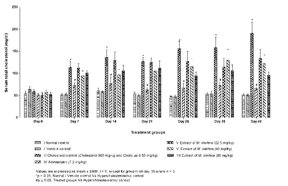 The mean serum total cholesterol level of all the groups at weekly intervals is presented in fig. 4. The group treated with Atorvastatin showed a significant decrease in mean serum total cholesterol level from day 7 through day 42 when compared with hyper-cholesterolemic control. The extract of M. oleifera at the dose of 90 mg/kg showed a non-significant decrease in mean serum total cholesterol level when compared with hypercholesterolemic control.