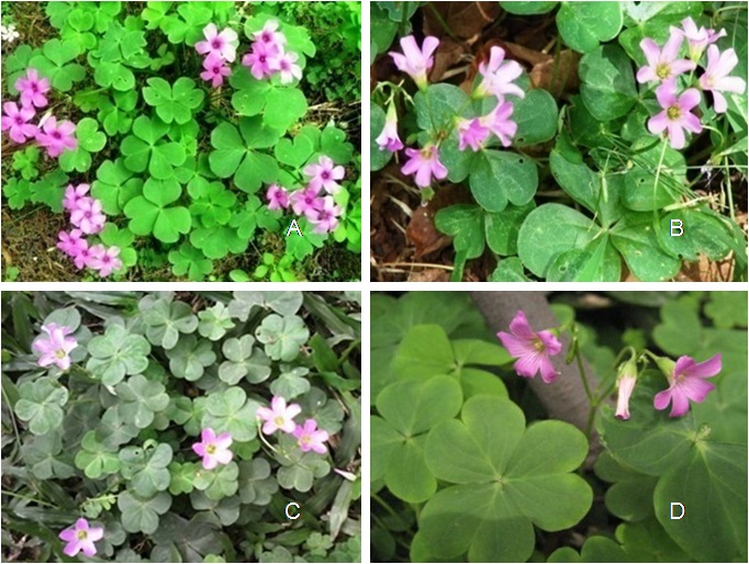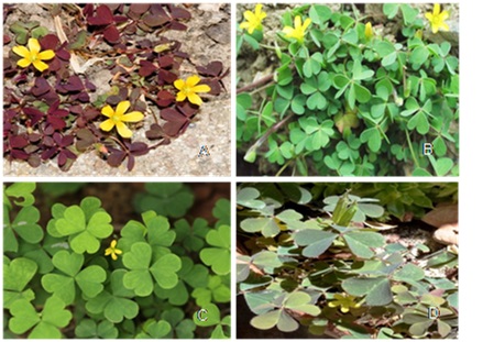 Fig. 1: Morphological characteristics of different ecotypes of O. corniculata. A): OC-Eco-1, B): OC-Eco-2, C): OC-Eco-3 and D): OC-Eco-4. OC= O. corniculata
