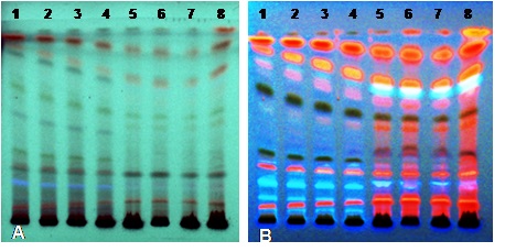 Fig. 3: TLC plate showing phytoconstituents of four ecotypes of O. corniculata (lanes 1-4) and O. debilis (lanes 5-8) respectively at 254 nm (A) and at 366 nm (B). Lane 1=OC-Eco-1, lane 2 = OC-Eco-2, lane 3= OC-Eco-3, lane 4 = OC-Eco-4, lane 5= OD-Eco-1, lane 6 = OD-Eco-2, lane 7 = OD-Eco-3, lane 8 = OD-Eco-4