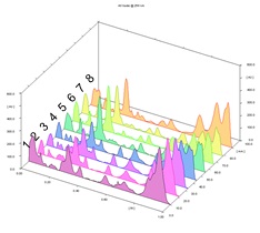 Fig. 4: HPTLC scan four ecotypes of O. corniculata (lanes 1-4) and O. debilis (lanes 5-8). Lane 1=OC-Eco-1, lane 2 = OC-Eco-2, lane 3= OC-Eco-3, lane 4 = OC-Eco-4, lane 5= OD-Eco-1, lane 6 = OD-Eco-2, lane 7 = OD-Eco-3, lane 8 = OD-Eco-4