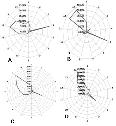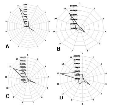 Fig. 6: Radar diagrams showing variations among ecotypes of O. debilis on the basis of Rf values of the phytoconstituents. A): OC-Eco-1, B): OC-Eco-2, C): OC-Eco-3, D): OC-Eco-4. OC-Eco = ecotype of O. debilis